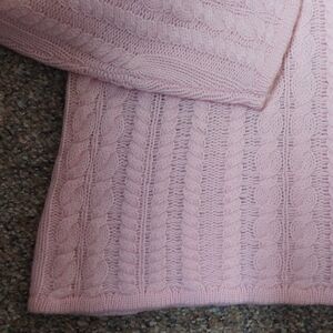 This Evelyn Grace sweater is a cozy 2 ply cashmere soft pink V-neck cable knit sweater. It's a stylish design, perfect for any occasion whether you pair it with your favorite jeans or your dress pants. The size is a fitted small but would be a comfortable xs.