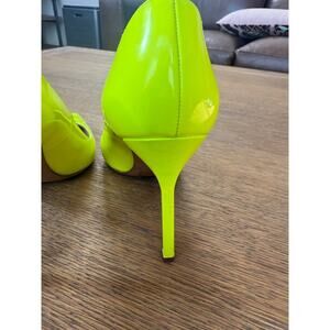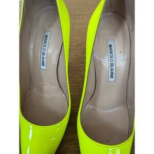 M a N o L o NEON yellow stunners. The main flaw is scuffing on back left heel (they have patent paint on Amazon that is this exact color). Teenist nick on front left toe. Condition reflected in price.