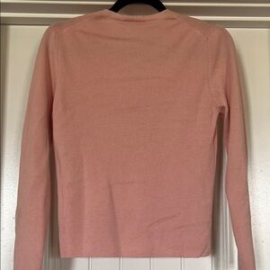 Elegant V-neck extra fine merino wool sweater in a gentle pink hue. 2 very minor stains shown in photos. Priced appropriately