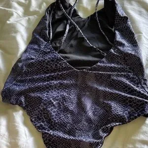 Stylish purple patterned swimsuit. Perfect for beach days. Acacia M worn