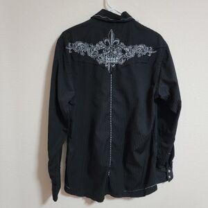 Stylish black button-up shirt featuring intricate white embroidery. Perfect for casual or formal occasions.