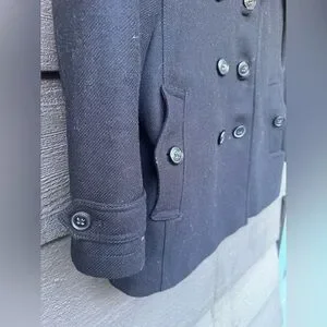 Burberry Brit peacoat (or pea coat?). Dark navy blue. US size 10. 71% virgin wool. 4% cashmere. 20% polymide (nylon). Bought last year on The Real Real. Excellent condition.