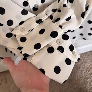 Elegant button-down with bold polka dots. Features a classic collar and long sleeves. Perfect for versatile styling.