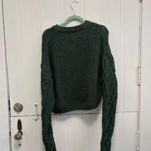 Chic cropped cardigan with cable knit design. Features button closure and long sleeves. Ideal for layering.