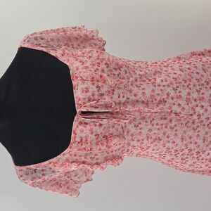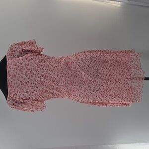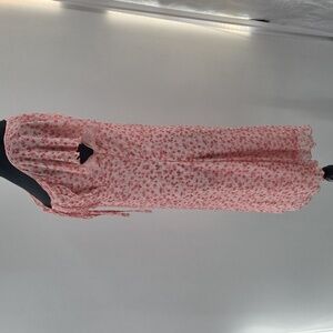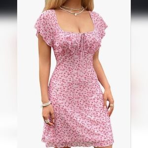Charming pink floral dress featuring ruffle sleeves and a fitted silhouette. Perfect for any occasion. NWOT AND IN EXCELLENT CONDITION!