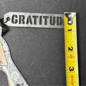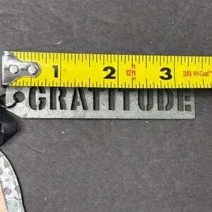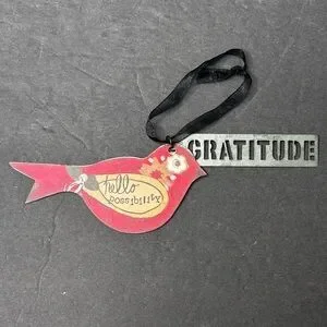 Kelly Rae Roberts Double Sided Bird Ornament “hello Possibility” on one side and “Hello Gratitude” on the other. This also has a metal hang tag with cut out letters that spell “GRATITUDE”. This is perfect to have on the outside of a present for a graduate or friend that needs encouragement. Both bird and hang tag are made of metal with a black ribbon hanger. Bird measures 4.5” across and 2” tall. Metal Gratitude hanger measures 3.5” across and .75” tall. Measurements are approximate.
