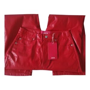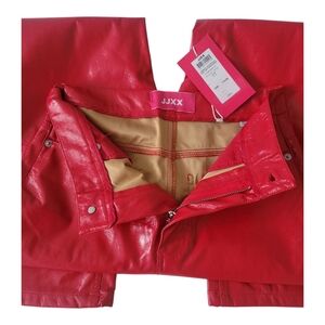These bold red pants feature a sleek straight-leg design crafted from high-shine faux leather, offering a modern and structured look. The vibrant color and glossy finish make them a standout piece for any occasion.