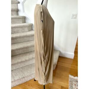 Excellent condition, however original brand and size tag are removed. Ribbed knit short sleeve maxi dress, scoop neck. Classic tan with lettuce hem. Very stretchy, oversize.