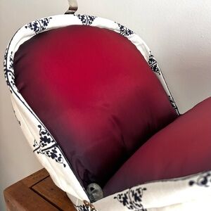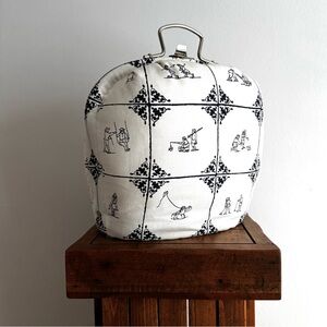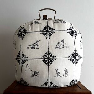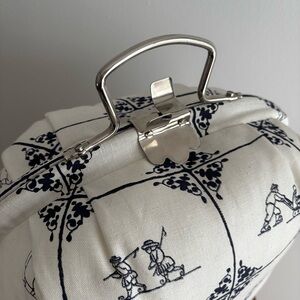 An adorable vintage case, with blue and white cotton Delft tile print fabric! The case has a metal frame inside, with a top handle and kiss-lock type clasp. It opens up like a clam, to reveal a very cushioned interior, done up in a reddish satin. The cushioning meets in the middle, so you'd use this to keep something special safe and secure, rather than tote about a whole lot of stuff. The base of the case is flat, so it stands nicely on a shelf for display. Amazing! **Update: thank you to the lovely @perriwinkle67 who verified that this meant for a tea pot! 🫖❤️ I suppose you could use it for anything you like, but protecting your tea pot is absolutely a worthy pursuit!