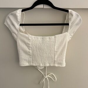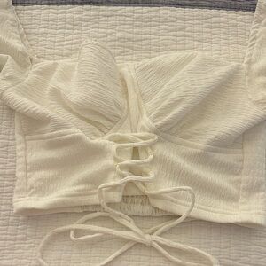 Chic ivory white with unique texture. Perfect for stylish outfits. You can adjust the tightness of the front of the top with the strings. Very flattering on.