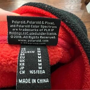 • Vibrant red and black colorblock with large Polaroid logo across the chest