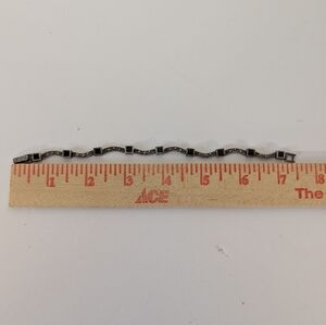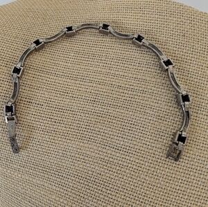 Sterling Onyx And Marcasite bracelet 7 inches in length. This is probably from the mid 1980s. Marcasite, Onyx with Sterling was really popular in the mid 1980s. This bracelet adds a piece of vintage history to any look and is perfect for any occasion.