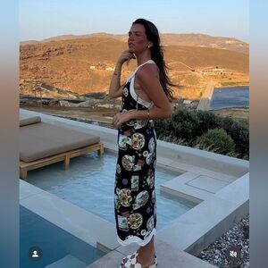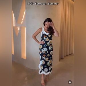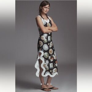 Farm Rio NWT Anthropologie Linen Sleeveless Scallop-Trim Slim Midi Dress size XS. Chic black and white dress with unique patterns. Perfect for a fashionable look.