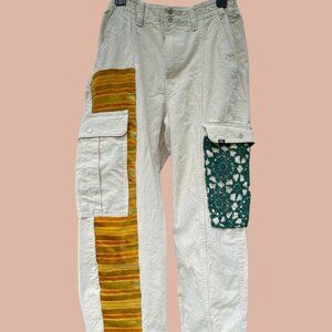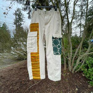 You are purchasing this pair of upcycled pants in “as is” condition. We do not offer returns, exchanges, or cancellations. Please keep in mind all of the textiles used to create this lovely garment are of unknown age and origin, making this a perfectly imperfect, sustainable item.