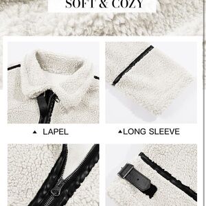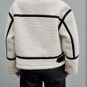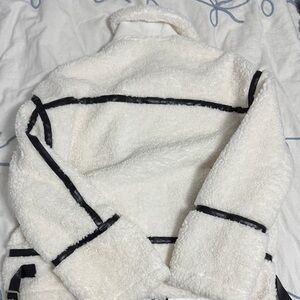 Cozy white sherpa jacket featuring black trim. Perfect for a stylish and warm look.