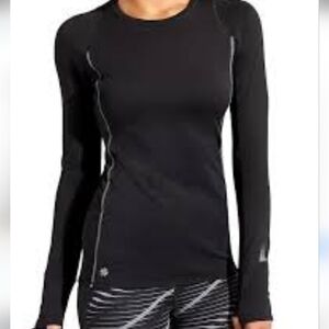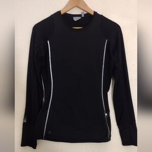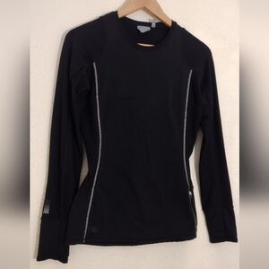 Sleek black long sleeve top. Ideal for workouts or casual wear. Features subtle design accents.