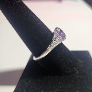 This elegant Bolivian amethyst solitaire ring showcases a vibrant purple oval shaped amethyst, beautifully set in high-quality sterling silver. The ring's shank is embellished with intricate filigree detailing, demonstrating exceptional craftsmanship. Designed for those who appreciate the artistry in jewelry, this silver ring is a sophisticated blend of classic style and artistic design.