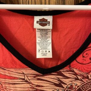 Vibrant red top with bold Harley-Davidson graphic with mesh sleeves and rhinestones. Size large in great used condition!