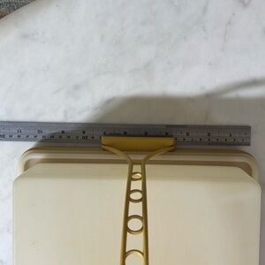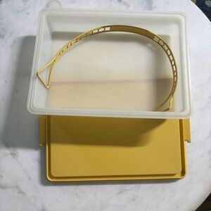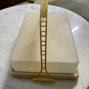 Vintage 70s Tupperware harvest gold 3-piece sheet cake carrier with handle. Includes the harvest gold base, sheer top and removable handle. This generation X classic is in excellent preowned condition with no scratches, cracks or melts. No markings or odd smells on the inside- it is nice and clean and ready to use!