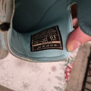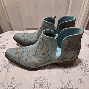 Stylish Roper ankle boots. Features blue base color with intricate all over western stitching. Deep V panels for easy movement and stylish look. Brown wooden sole adds elegance. Never worn.