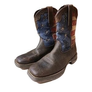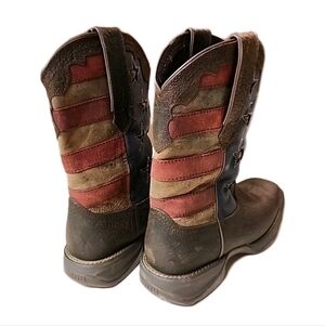 The Durango 10" Vintage Flag Brown Western Boots in women's size 9M from the Durango Lady Rebel line are a stylish and versatile choice for any occasion. Featuring a square toe, pull-on closure, and low block heel, these mid-calf boots offer comfort and support for all-day wear. The brown leather upper and embroidered American flag accents give them a patriotic and cowboy-inspired look, perfect for casual outings or workwear. With a cushioned insole and slip-resistant outsole, these boots are both practical and fashionable, making them a must-have addition to any wardrobe for any season.