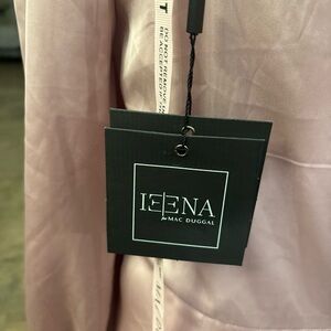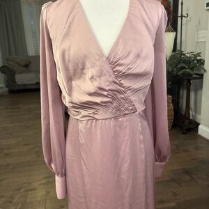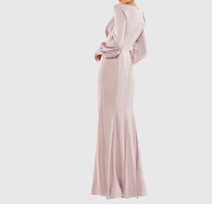 This stunning gown by Mac Duggal features a soft pink hue, perfect for a bride or wedding guest. The dress boasts a plunging V-neckline and elegant bishop sleeves, creating a sophisticated and romantic silhouette. Its flowing A-line skirt and silky fabric make it ideal for formal occasions.