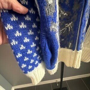 This Vintage IB Diffusion Sport Cardigan is Made In Hong Kong and in core color of Off White with Blue and Gray. It is a beautiful mix stitch design and is oversize with a mock neck. It is a Long T-Sleeve full Zip Front. There are slit side pockets on both the right and left of the sweater - see pictures.