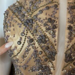 ** Please note, the dress is new with the tags still on it however, there is some missing beading on one side of the dress directly over the chest area. Please refer to the photos, I have pointed to the area that would need repair ** (Hanging)