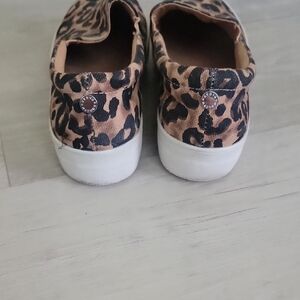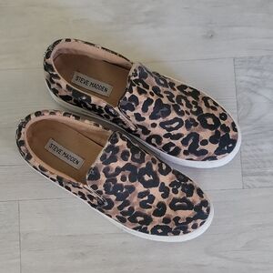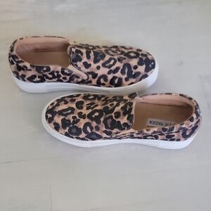 These Steve Madden sneakers feature a bold leopard print in brown and black, offering a stylish and eye-catching design. The slip-on style ensures easy wear, while the thick white rubber sole provides excellent cushioning for all-day comfort.