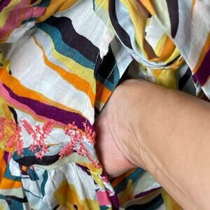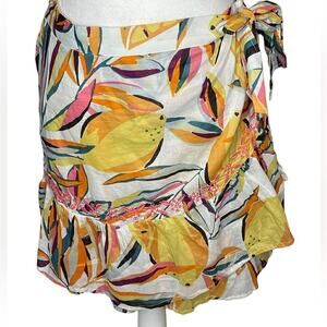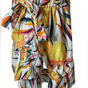 Bright, fun mini skirt featuring a colorful lemon and tropical print with embroidered detailing and a tiered hem. Lightweight 100% cotton fabric makes this skirt perfect for warm-weather styling. Faux wrap waist adds a flattering, easy fit.