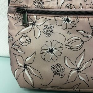Elegant crossbody bag with floral quilted design. Features adjustable strap and secure zip closure.