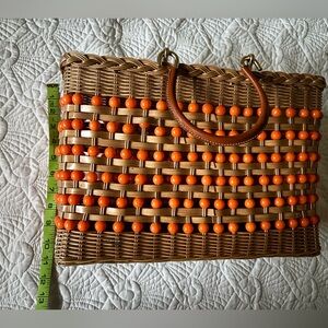 Incredible vintage tote. Coated weaving strung with vibrant orange beads. Great condition for its age.