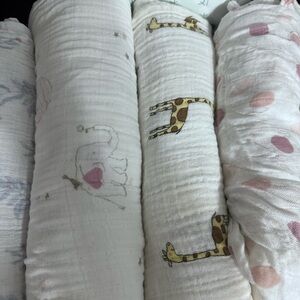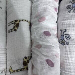 Wrap your baby in comfort with the Aden + Anais Organic Cotton Baby Swaddle Blanket Set. Featuring 5 gently used blankets; 1 rayon and 4 cotton. These are soft, breathable fabric in white and pink, and they are perfect for a cozy sleep.