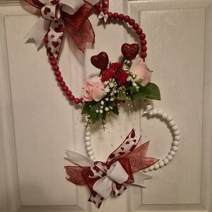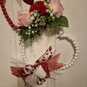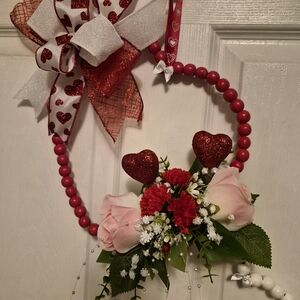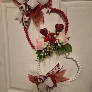 Decorate your door or wall with this beautiful heart wreath. Handcrafted with two beaded hearts , double bows , and center flowers. It's one of a kind , measuring 24 " bow to bow , and 10 " wide . Thanks for looking at all my handcrafted Wreaths, Swags , and other decor.