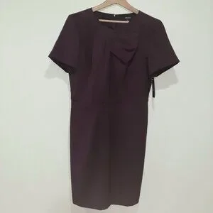 New with tags. This dress is a deep warm plum color with short sleeves. It has a half bow on one side that gathers into pleats around collar and give the dress a touch of elegance. Zipper closure in the back and is fully lined. The perfect dress to elevate your look!