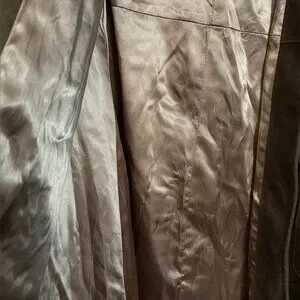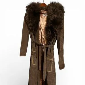 Vintage long brown coat featuring a genuine lamb fur trim and a matching suede belt to cinch the waist for a flattering silhouette. Crafted with high-quality leather and suede materials, fully lined in acetate. Excellent vintage condition. Fur collar is not removable.