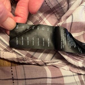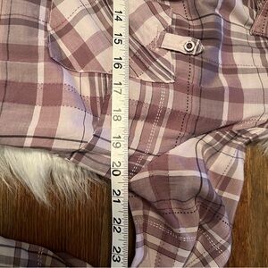 Stylish plaid button-up top for women. Features a classic design with a comfortable fit. Perfect for casual outings. Women’s medium purple plaid, lightweight tensel. Measurements in photos, please let me know if you have any questions!