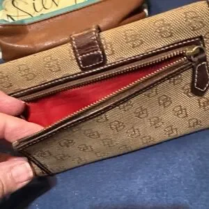 Elegant tan wallet with monogram pattern. Features a secure clasp and compact design.