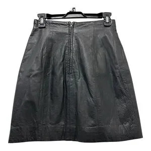 Classic vintage black Wilsons Leather skirt crafted from genuine leather with a fully lined interior for comfort and structure. Features a clean, flat waistline (non-elastic), flattering A-line mini silhouette, and a sleek back zipper closure. Timeless 90s/Y2K minimalist style—perfect with boots, tights, or heels.
