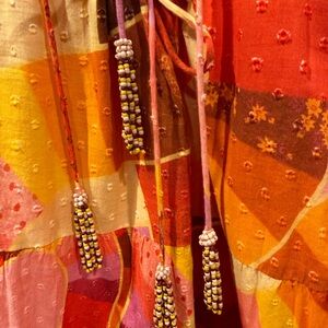 Rio dress. Features a V-neck line and drawstring mid closure, the dress is perfect for any occasion, from travel to parties, to casual outings. The colorful abstract pattern l, beautiful beaded tassels and tiered ruffles add a touch of whimsy and elegance to the dress while the puff sleeves and drawstring waist provide comfort and and give a flattering shape. The 100% cotton fabric ensures breathability, making it ideal for summer or spring.