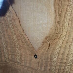 Very flowy and lightweight! Fits small to medium. I am size Medium and it fits great. It is missing the top button near the neckline.