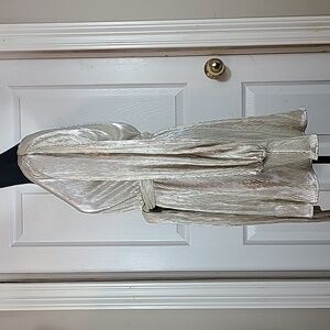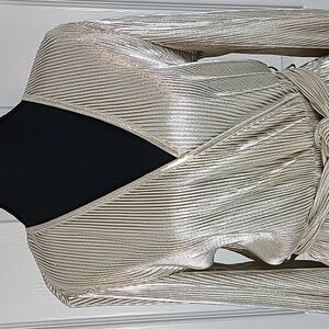 Long Elastic Sleeves, Deep V Neckline, Crossover Bodice, Waist is Elastic With Sash Tie, Pleated all Over in Metallic Gold, Size Small.