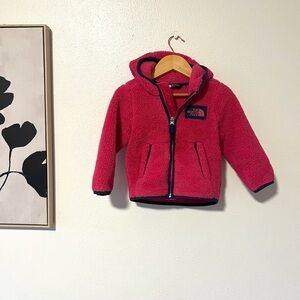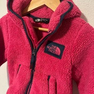 Bright pink fleece hoodie by The North Face. Features front zip and cozy hood.