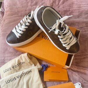 Elegant sneakers with classic monogram pattern. Features brown upper and white laces.