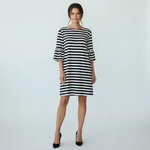 Timeless and easy to wear, this Gianni Bini black and ivory striped dress features a relaxed shift silhouette with statement bell sleeves. Designed with a pull-on fit and fully lined interior, it offers both comfort and polish.