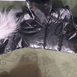 Keep your dog warm and stylish with this black dog jacket featuring a cozy faux fur trim. Perfect for chilly days.