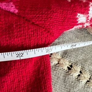 Celebrate the season with this charming red and green sweater, featuring playful holiday designs. Perfect for adding a touch of festive cheer to your wardrobe. Excellent preowned condition, measurements are shown, smoke free home.