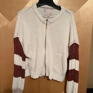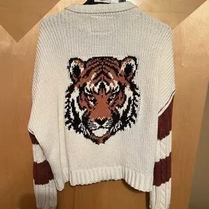 Cozy cardigan with bold tiger motif. Cream base with brown accents. Perfect for a stylish, wild touch.
