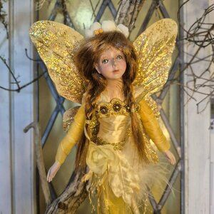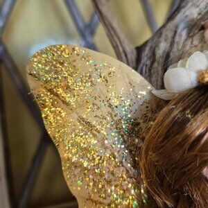 Stunning vintage Fairy figurine that shines in her gold, cream and yellow ribbon dress. Her glittering wings, her arms and her legs are moldable. She has gold tattoos on her forehead and neck (see photo). Feeling nostalgic? Hang this fairy on your Christmas tree to bring back the magic of Christmases past. Love Fairies? She'll make a superb decorative piece. And like all mythical creature figurines, she'll come to life at night to enchant your home!