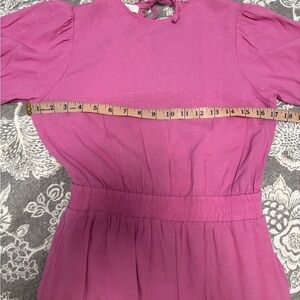 Chic pink dress with double ruffled skirt and short sleeves. Perfect for any occasion and lightweight. New without tags. Fits a size 6(model wear) and waist has some stretch.